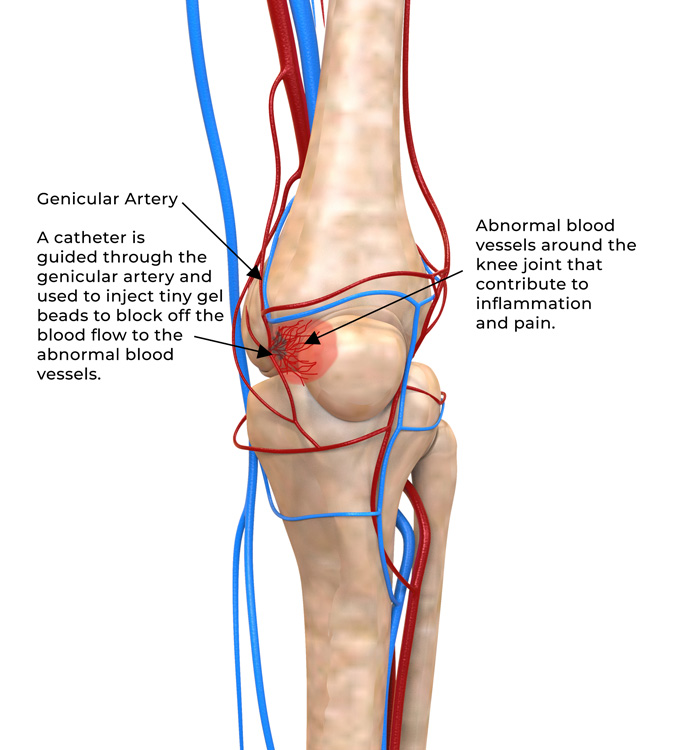 In osteoarthritis, abnormal blood vessels develop around the knee joint and sustain ongoing inflammation and pain. By closing off these abnormal vessels, GAE helps reduce inflammation and significantly relieve chronic knee pain.